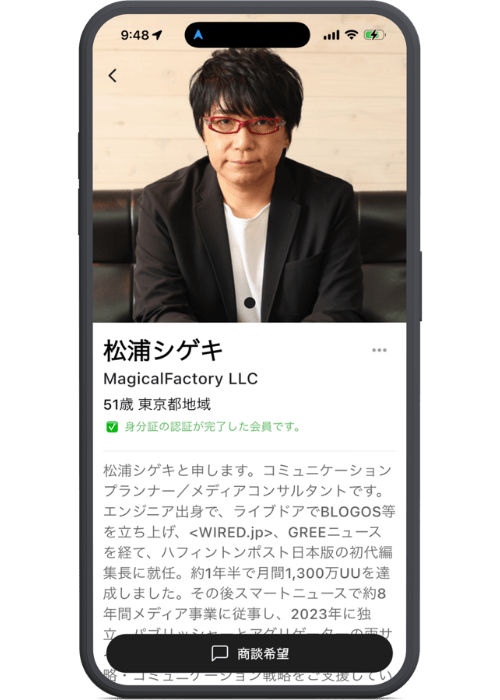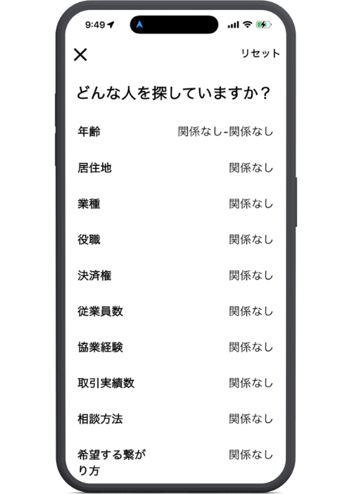 会社名や事業内容、自己紹介、地域などをしっかり入力することで、 相手から見つけてもらいやすくなります。