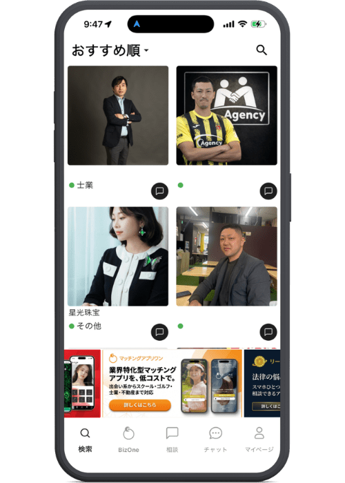 BizOneは、完全無料で利用できるビジネスマッチングアプリです。