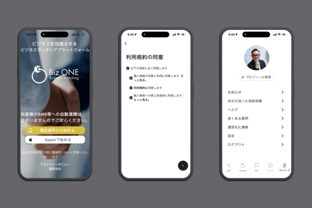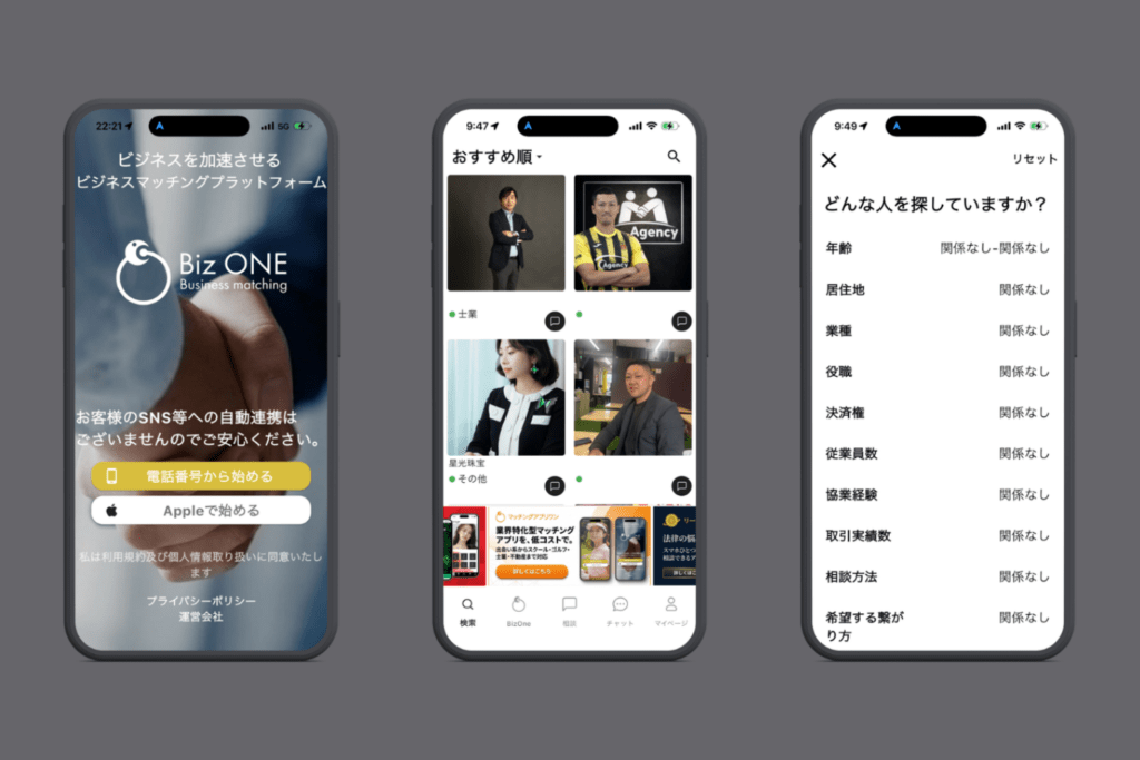 BizOneは、完全無料で利用できるビジネスマッチングアプリです。